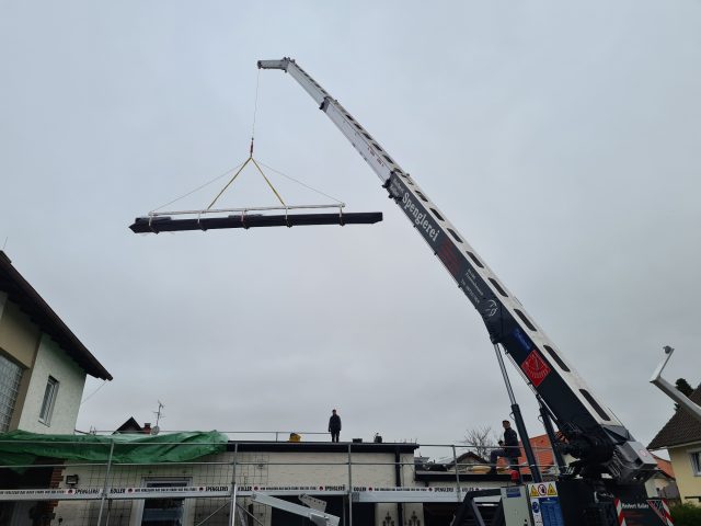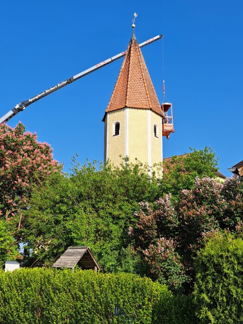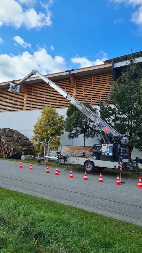 Mit unserem Anhängerkran, der auch als Hebebühne eingesetzt werden kann, erreichen wir selbst schwer zugängliche Stellen schnell, sicher und unkompliziert.